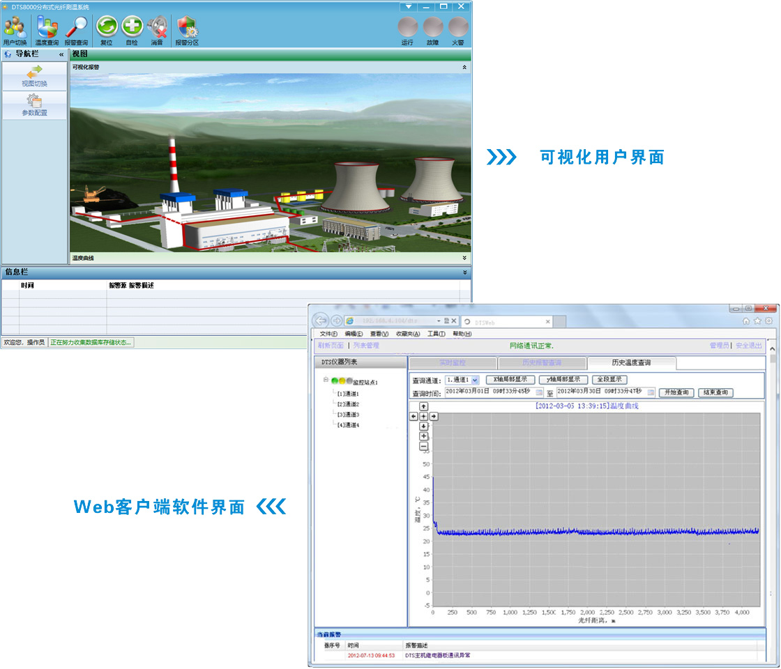 DTS8000用户软件为自主设计开发,为用户提供人性化、功能完善的中文交互界面,实时显示温度分布曲线和待测区域报警状态,可根据实际工况分区设置多级报警阈值,并提供历史数据查询及统计分析功能。同时,可针对客户具体应用,量身定制开发功能模块,如可视化界面,电力载流量监测模块,远程中央监控模块等。