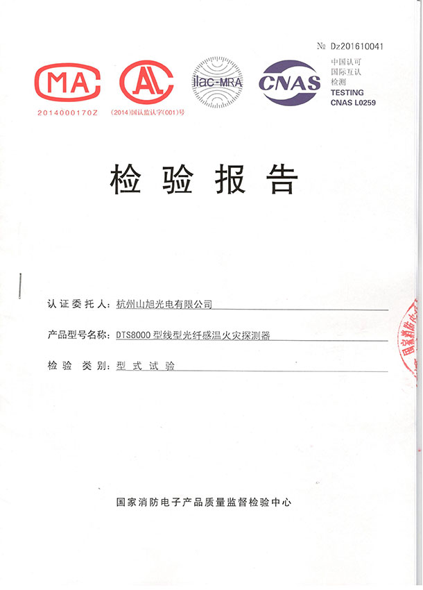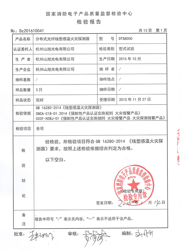2016年01月14日,山旭光电DTS8000分布式光纤线型感温火灾探测器获得获得国家消防电子产品质量检验中心颁发的型式检验报告,符合GB 16280-2014 《线型感温火灾探测器》要求。