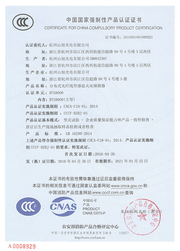 2016年04月26日,山旭光电DTS8000分布式光纤线型感温火灾探测器获得了《中国国家强制性产品认证证书》,该证书由公安部消防产品合格评定中心颁发。