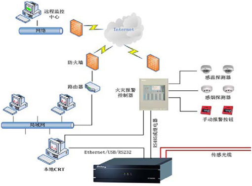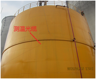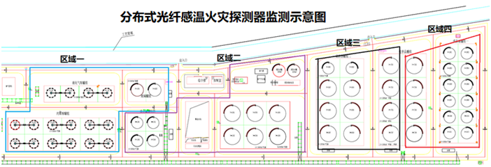本项目用于储油罐的火灾检测,采用分布式光纤测温系统DTS8000和传统火灾报警系统相结合的方式,探测光纤敷设于厂区内区域监测各个储油罐。DTS将实时温度显示出来,及时发现过热点,一旦发现所测量环境温度值或温升速率超过设定阈值时,系统自动报警,并通过以太网或者继电器将实时报警信号送到监控室以及火灾报警主机,便于值班人员处理以及消防联动。
