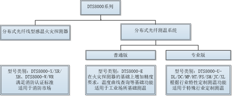 DTS8000系列产品包括分布式光纤线型感温火灾探测器和分布式光纤测温系统两大类。